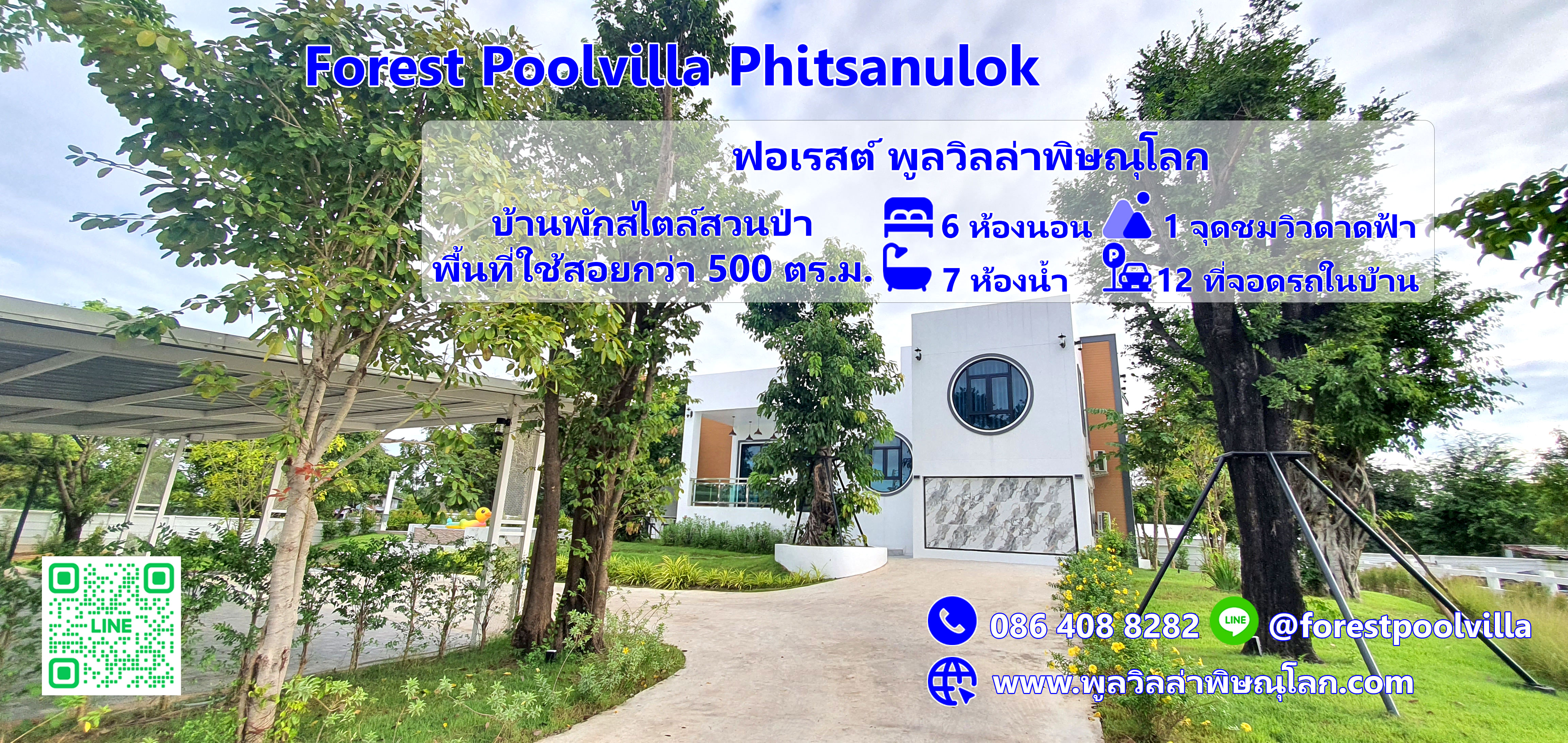 ฟอเรสต์พูลวิลล่าพิษณุโลก เป็นบ้านพักตากอากาศสไตล์สวนป่าพร้อมสระว่ายน้ำส่วนตัว เชิญให้คุณมาสัมผัสประสบการณ์การพักผ่อนที่ไม่เหมือนใคร ที่พักพิษณุโลกตั้งอยู่ในทำเลที่สะดวกสบาย ใน อ.เมือง จ.พิษณุโลก ครอบคลุมพื้นที่เกือบ 1 ไร่ ให้คุณได้สัมผัสความเป็นธรรมชาติอย่างแท้จริง พร้อมกับสิ่งอำนวยความสะดวกสบายอย่างครบครันที่ได้คัดสรรไว้อย่างลงตัว ฟอเรสต์พูลวิลล่า บ้านพักพูลวิลล่าที่ตอบโจทย์ทุกความต้องการของคุณ
